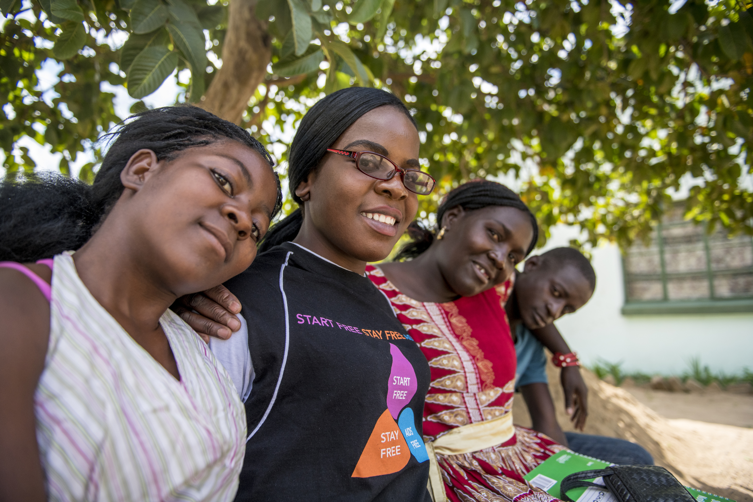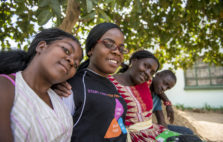 Rosa meets with HIV Champions. From left: Thain Nhanga, Rosa Mahlasera, Lavender Mandengu, and Edwin Muhicoci. Photo by Eric Bond/EGPAF 2018