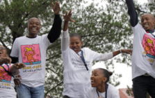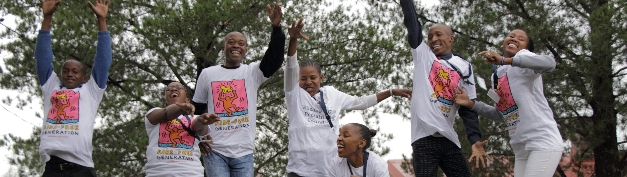 Group of Black people in ‘AIDS-FREE GENERATION’ T-shirt jumping up and laughing