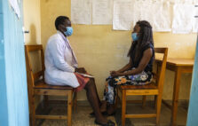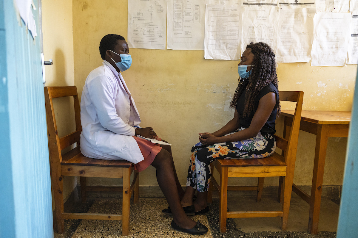 Philister Akumu ( in white overcoat) talks to a mother Merigoreti Omondi in Homabay county hospital on 26 July 2021.Mentor mothers play a useful role in supporting HIV positive mothers suppress the infection and take care of their children. EGPAF partners with Homabay county ministry of health to support HIV treatment.