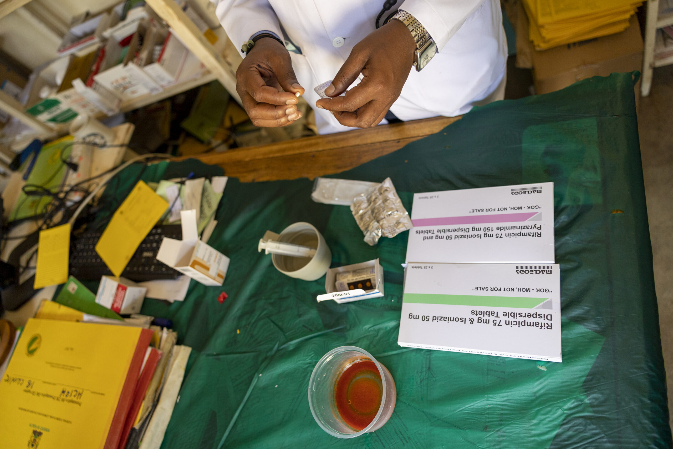 Clinical officer showing child friendly medicine in Homabay county hospital.EGPAF worked in partnership with ministry of health Homabay county to implement CaP TB (Catalyzing Pediatric TB). CaP TB sought to reduce childhood illness and deaths due to TB in Homabay and Turkana counties by developing, implementing and documenting innovative models of care and catalyzing their wide-scale implementation to improve case detection and treatment.